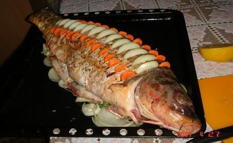 Аккуратно уложите рыбу на слой лука. В процессе подготовки не забудьте о начиночной – фаршируйте брюшко рыбы луком, морковкой, несколькими дольками лимона и петрушкой. В надрезы вставьте по кусочку сливочного масла, чтобы блюдо получилось более сочным. Особенно интересно украсить карпа: нарежьте лук полукольцами и расположите их в центральной части резов, морковь также нарежьте и вставьте по бокам от лука. Все эти детали придадут карпу изысканный вид.