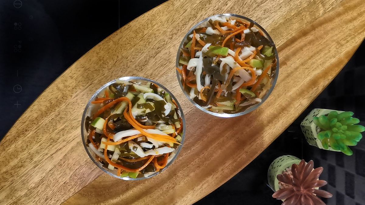 1. **Приготовление кальмаров**. Сначала следует отварить кальмары, уделяя внимание времени, чтобы не переварить их. После приготовления их необходимо охладить и нарезать тонкой соломкой.