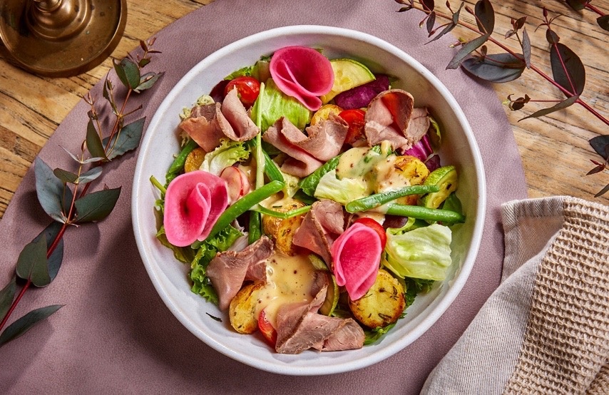 - Салат с ростбифом и яйцом: Это праздничное угощение подойдет для особых случаев. Яйца пашот добавят изысканности, а плоское блюдо украсит ваш стол.
