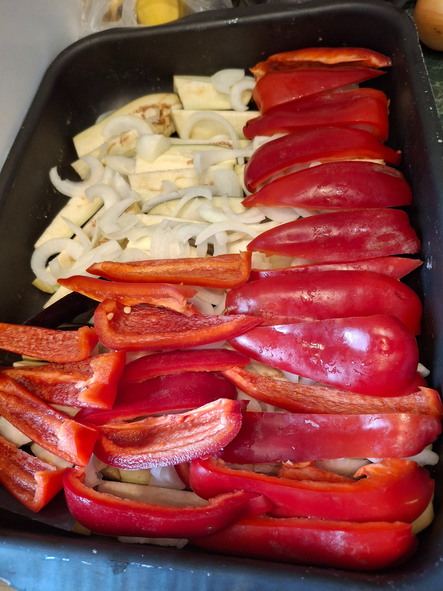Сначала на противень налили немного растительного масла, затем уложили предварительно нарезанные баклажаны. Овощи укладывались поэтапно: слегка присоленные баклажаны, сверху лук, нарезанный полукольцами, за ним следовал болгарский перец. Следующий шаг – приготовление томатной заливки из помидоров и одного красного перца с помощью блендера. Эта смесь добавлялась к овощам, создавая ароматы и текстуры.