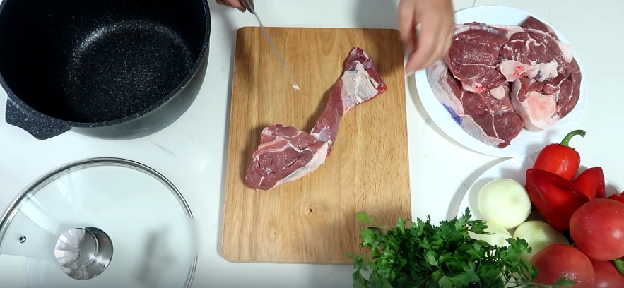 Начните с тщательной промывки баранины, удалите лишние жилки и нарежьте мясо крупными кусками, предпочитая делать это с костью для более насыщенного бульона.