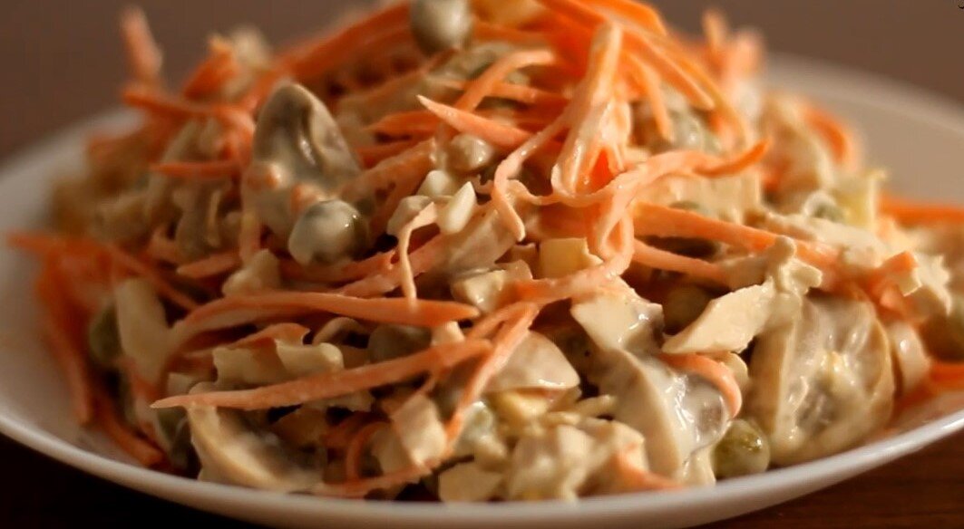 Необходимо нарезать курицу и яйца кубиками, шампиньоны — тонкими пластинками. Затем нужно соединить все ингредиенты с майонезом и тщательно перемешать.