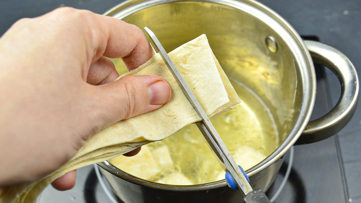 1. Подготовка лаваша: Начните с нарезания тонкого лаваша на полоски, затем уменьшите их до более мелких кусочков.