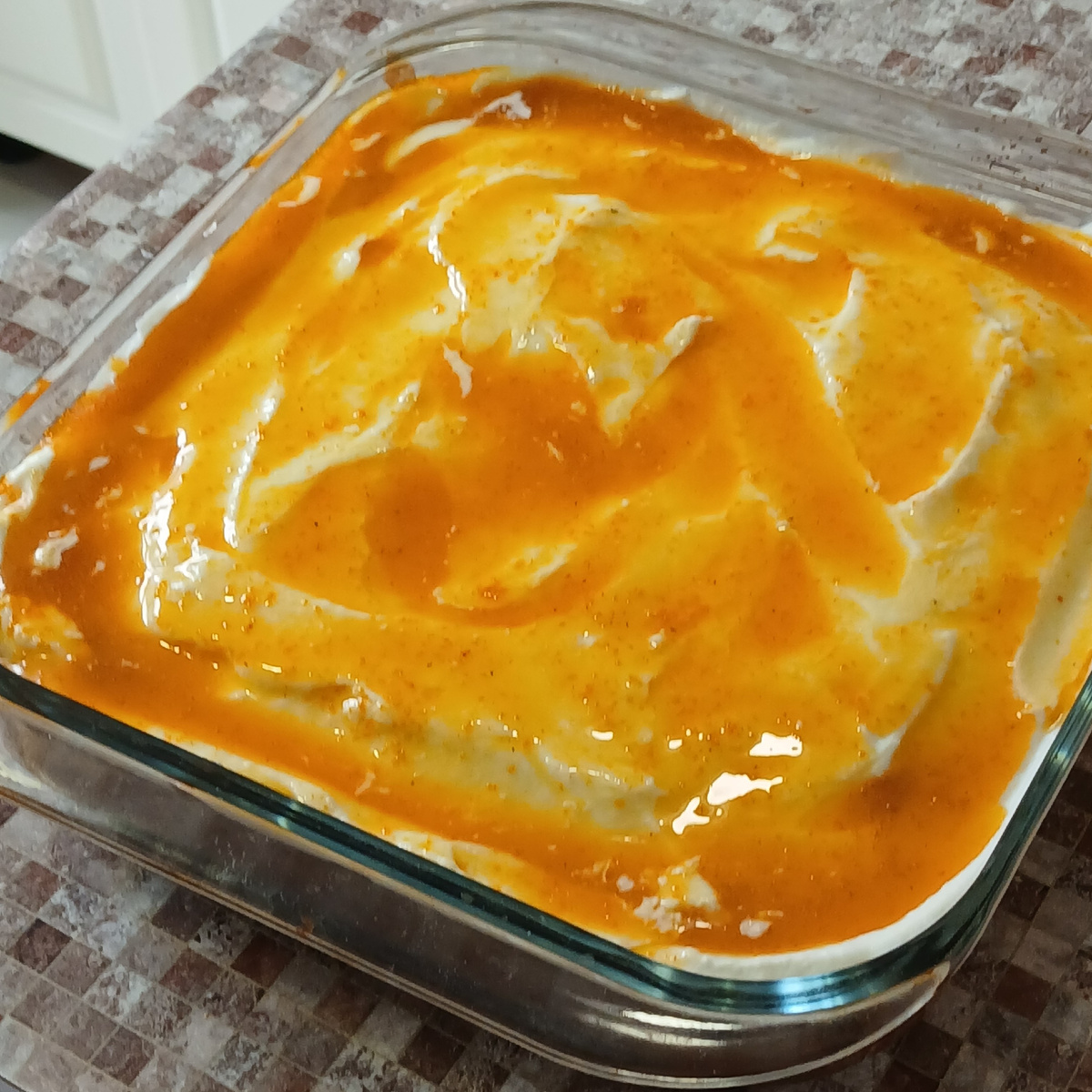 Когда пирог остынет, аккуратно наносим сметанный крем, сверху добавляем облепиховое пюре, создавая красивые разводы на поверхности.