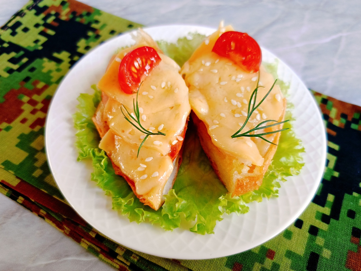 Затем укройте бутерброды плавленым сыром, который придаст им неповторимую текстуру.