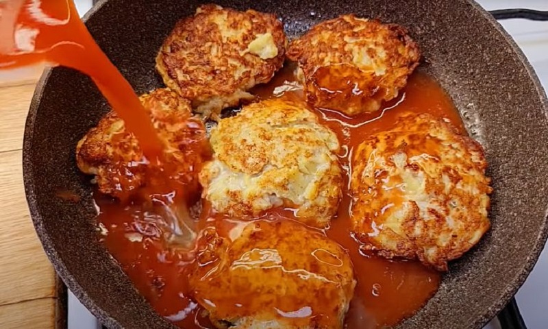 Для начала нарежьте куриное филе мелко, чтобы сохранить сочность. Лук и картофель натрите на терке для лучшего объединения с фаршем. Все составляющие перемешайте с яйцом, солью и перцем. Сформируйте котлеты и обжарьте на разогретой сковороде до лёгкой корочки, затем залейте смесью воды и томатной пасты. Закройте крышкой и тушите 15 минут на слабом огне для полного раскрытия всех вкусов.