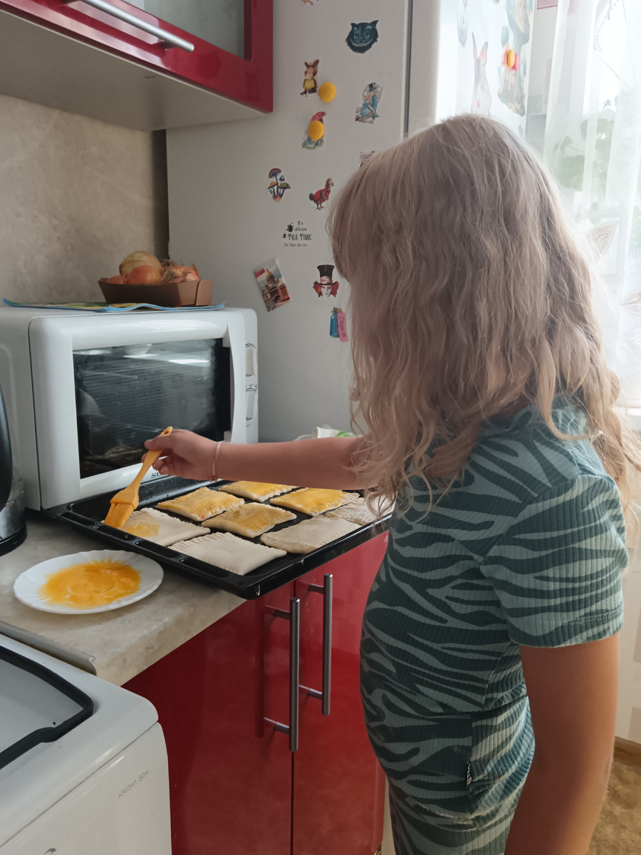 Девочки усердно трудились — с помощью пальцев и вилки лепили конвертики с джемом, каждый из которых получил свою уникальную форму. Противень, смазанный сливочным маслом, заполнился аппетитными пирожками, а вскоре раздался приятный запах выпечки.