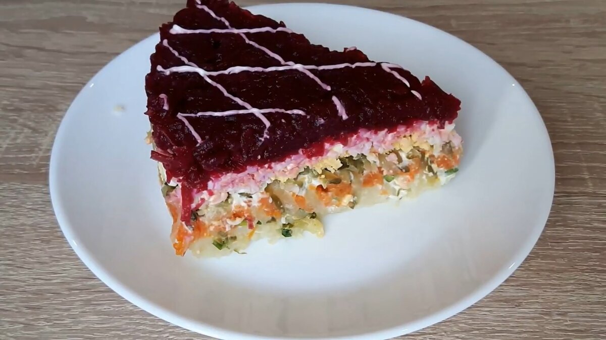 Результатом стал слоеный салат, напоминающий «шубу». Он получился не только аппетитным, но и привнес оригинальность на стол. Вот список ингредиентов: