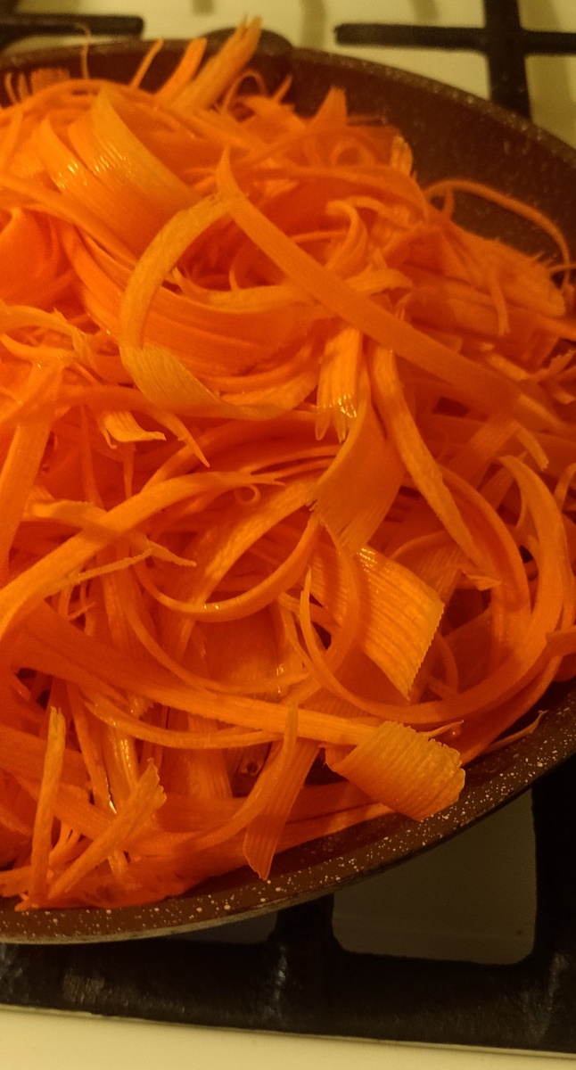 Кабачки нарежьте брусочками и слегка обжарьте с добавлением сухой мяты, чтобы подчеркнуть их вкус. Морковь нарежьте тонкой соломкой и также обжарьте, добавив к ней сочные сегменты апельсина — они придадут блюду свежесть и лёгкую кислинку.