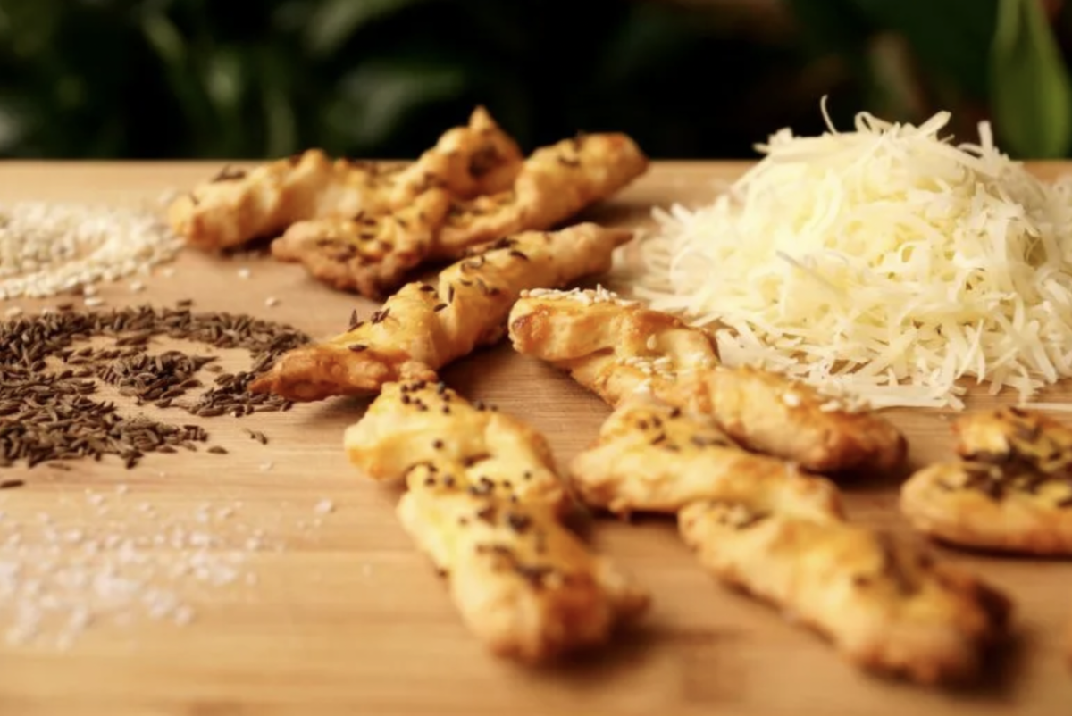 Разделите тесто на четыре равные части. Две из них раскатайте до толщины около 2 мм. На один пласт выложите половину сырной начинки, а затем накройте вторым пластом. Пресуйте и смажьте яйцом. При желании посыпьте специями, порежьте на полоски шириной около 2 см и выложите на противень. Запекайте при температуре 200 градусов в течение 8–10 минут, периодически проверяя готовность.