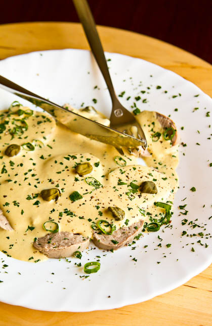 Запечатать очищенную телячью вырезку в пергамент, придавая форму колбаски, и зафиксировать нитью. Затем поместить в кипящий бульон.Накрыть кастрюлю и отключить нагрев, позволяя мясу медленно готовиться в остывающей жидкости.Оставить телятину в бульоне на 3-4 часа для остывания.За час до завершения приготовления соуса: в миске смешать желтки с горчицей, солью и перцем, постепенно добавляя растительное масло, как при приготовлении майонеза.После создания основы соуса, добавить консервированного тунца, анчоусы, половину каперсов и пару ложек бульона от мяса. Измельчить всё блендером до однородной консистенции.Проверить вкус соуса, при необходимости подкорректировать соль и перец, а также добавить бульон для достижения желаемой текстуры, напоминающей жидкую сметану.Когда телятина остынет, нарезать её тонкими ломтиками. Разложить по тарелкам с небольшим нахлёстом и обильно полить соусом.Перед подачей украсить блюдо измельчённой зеленью и оставшимися каперсами.С таким простым, но изысканным рецептом можно наслаждаться атмосферой итальянского застолья прямо у себя дома. Приятного аппетита!