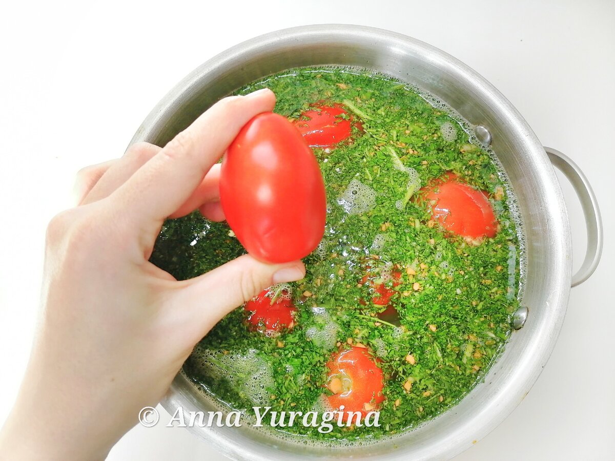 Для первого рецепта, помидоры заливаются кипятком и оставляются под крышкой на 15 минут. За это время из помидоров сливается вода, которую следует довести до 1.5 литров и добавить соль с сахаром. Как только рассол закипит, добавляем уксус и заливаем им помидоры, закрываем крышками и укутываем под одеяло.