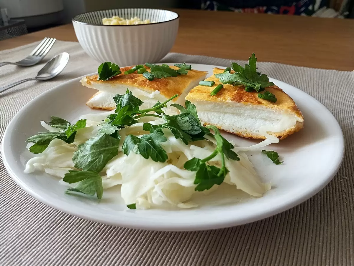 - Нутовая лепешка со шпинатом и креветками, поданная с йогуртом.