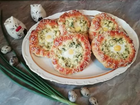 Выпекать ватрушки нужно при температуре 190°C в течение 30 минут. После этого с помощью чайной ложки в начинке делаются углубления, в которые помещаются перепелиные яйца. Ватрушки возвращаются в духовку еще на 5-7 минут, чтобы глазурь красиво запеклась.