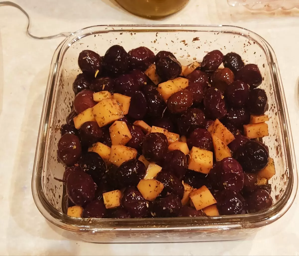 Сыр нарезается на аккуратные кубики: чем больше, тем дольше они пропитаются маслом, соответственно, удачно будет сделать средние кусочки, чтобы их удобно было есть. Затем оливки и сыр помещаются в контейнер, к которым добавляются специи. Важно хорошенько перемешать ингредиенты.