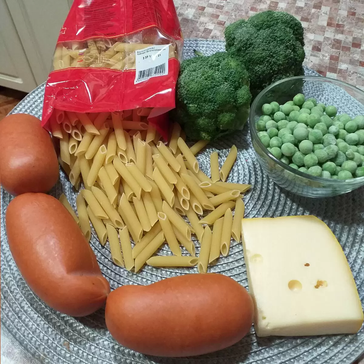 Шпикачки нарезаются брусочками, а сыр натирается на мелкой тёрке. Далее в большой миске соединяются макароны, шпикачки и пюре из брокколи и горошка, оставив немного пюре для оформления. Всё тщательно перемешивается, после чего необходимо выложить получившуюся массу в форму для запекания, предварительно покрыв её оставшимся пюре. Сверху посыпать оставшимся сыром и запекать в заранее разогретой до 180 градусов духовке 20-25 минут.