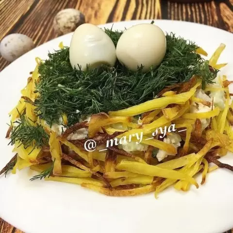 5. Выложите салат на тарелку в форме «гнезда», украсьте запеченной картошкой, укропом и перепелиными яйцами.