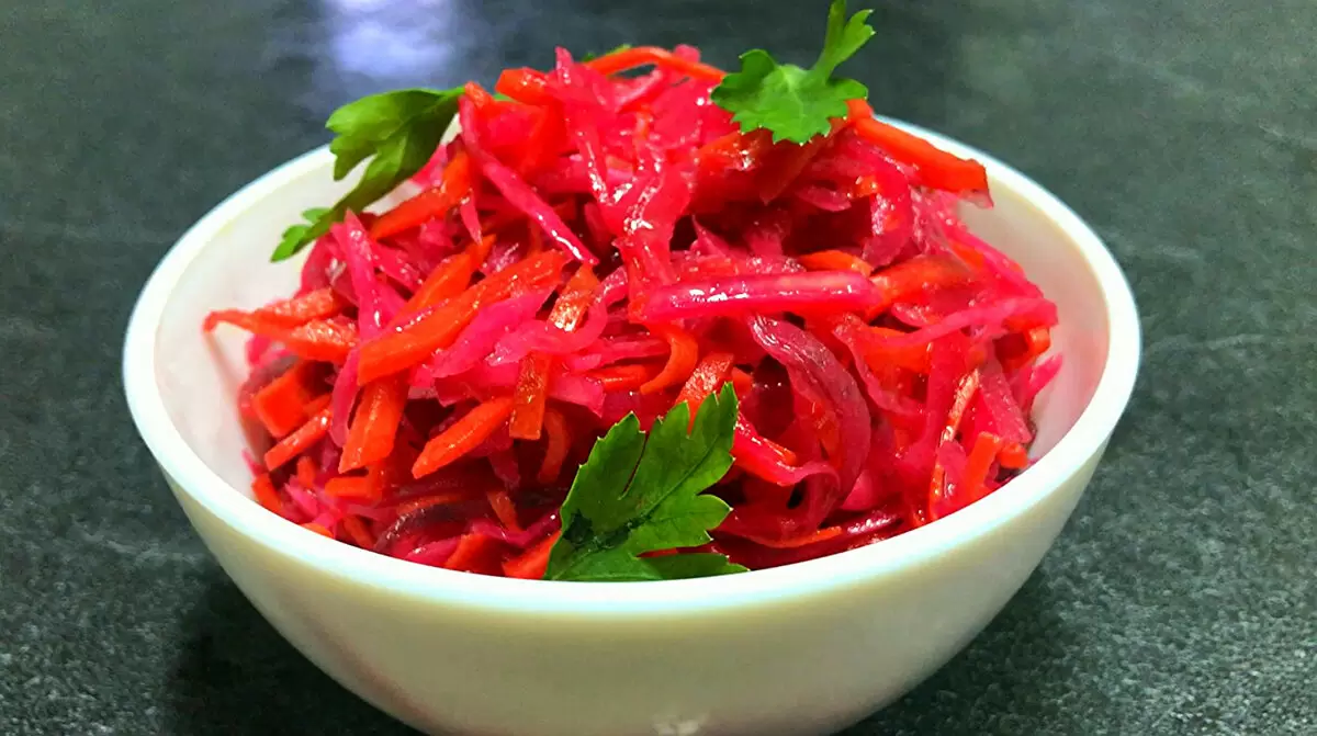 Приготовление начинается с нарезки капусты, моркови и свеклы. Овощи следует нарезать тонкой соломкой; это можно сделать как с помощью терки, так и ножом. Далее, нарезанный репчатый лук добавляется к остальным овощам в миске. Все ингредиенты тщательно перемешиваются.