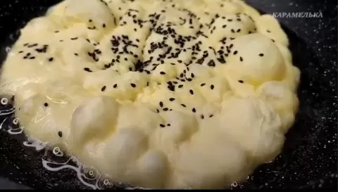 3. Формирование и жарка: Отделите от теста кусочки размером с мандарин и раскатайте их в круглые лепешки толщиной около 0,5 см. Посыпьте одну сторону кунжутом и прижмите, чтобы он хорошо приклеился. Разогрейте сковороду с достаточным количеством растительного масла. Обжаривайте лепешки с обеих сторон до золотистой корочки, пока они не начнут подниматься и образовывать пузырьки.