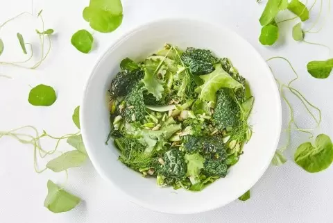 Начать с приготовления заправки. Мелко нарезанный белый салатный лук можно обработать в блендере до получения однородной массы. Соедините лук с 50 мл оливкового масла, медом и уксусами, тщательно перемешайте. Полученной заправки хватит примерно на две порции салата.В глубокой тарелке разместите 70 г заправки, затем добавьте рваные на кусочки салатные листья.Семечки подсолнечника обжарьте до хрустящего состояния и дайте им остыть.Тонко нарежьте зелёное яблоко и молодые цукини, добавьте их в тарелку с салатом. Высыпьте обжаренные семечки.Сбрызните салат оставшимся оливковым маслом, посолите и поперчите по вкусу. Две ягоды вяленой клюквы можно измельчить, а остальные добавить целиком в салат. Завершите блюдо ягодной крошкой и подавайте к столу.