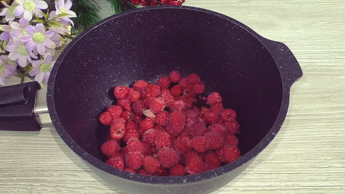 Процесс начинается с ягодной начинки. В кастрюлю помещаются 200 г замороженных ягод — в данном случае, малина. Ставим на плиту, доводим до кипения, провариваем минуту.