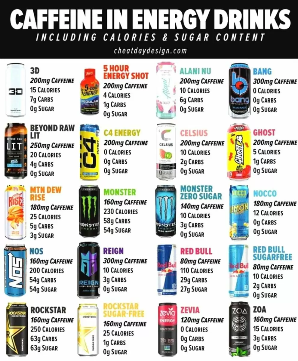 На первом месте по кофеину стоят напитки Bang и Reign, в каждой банке которых содержится целых 300 миллиграммов на 473 миллилитра. Замыкает тройку лидеров Beyond Raw Lit с 250 миллиграммами. Напитки 3D, 5-hour Energy Shot, C4 Energy, Alani Nu, Celsius и Ghost имеют по 200 миллиграммов кофеина, хотя объемы их упаковок различаются: например, 5-hour Energy Shot представлен в маленьких бутылочках по 57 миллилитров. Наименьшее количество кофеина — у вариантов Red Bull: 80 миллиграммов в банке объемом 250 миллилитров.