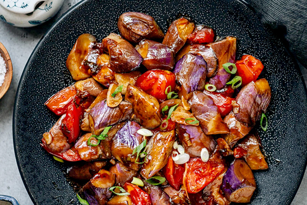 Соус также играет важную роль благодаря своей сбалансированности: бульон добавляет объём, светлый соевый соус отвечает за вкус, а уксус привносит кислотность. Блюдо не будет перенасыщенным томатами или соевыми нотами, а будет держаться на текстуре баклажанов и аккуратно собранном соусе.