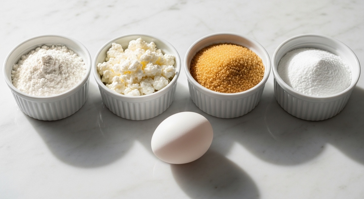 Смешать творог, яйцо, сахар, крахмал и кокосовую стружку. Тщательно размять до однородной массы. Если консистенция окажется слишком жидкой, следует оставить массу на 5 минут, чтобы стружка впитала лишнюю влагу. Из полученной смеси сформировать 18 небольших шариков и заморозить на 30 минут, чтобы начинка не растаяла в тесте.