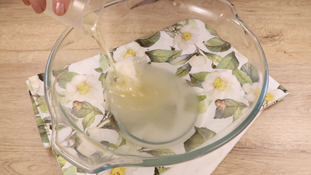 На первом этапе в глубокой тарелке следует соединить сахар, ванильный сахар и небольшую щепотку соли. Затем добавить воду и растительное масло. С помощью венчика тщательно перемешать массу до полного растворения сахара.