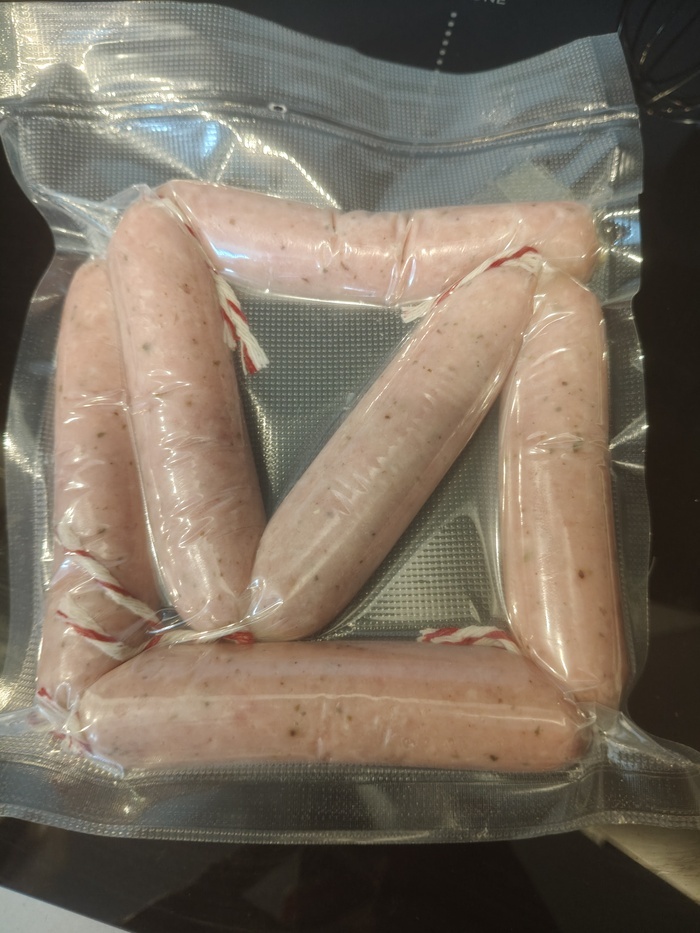 Фарш помещается в планетарный миксер, куда добавляются пахта и вода — все тщательно перемешивается. Далее следует этап набивки сосисок в оболочку с помощью шприца. Формировать колбаски можно на ваш вкус: от крупных до миниатюрных, а для тех, кто не умеет связывать сосиски, подойдет шпагат.