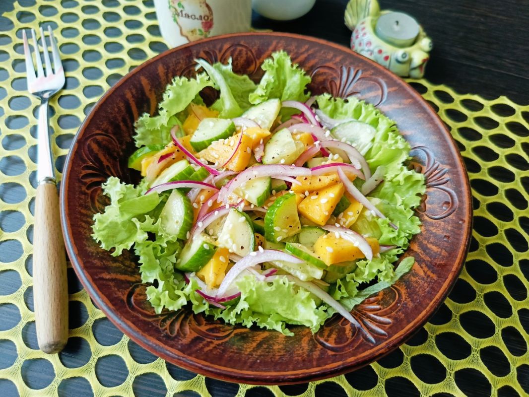 Этот легкий и яркий салат завоевал популярность благодаря своему экзотическому вкусу и простоте приготовления. Свежий огурец придает ему нейтральный вкус, а манго добавляет сладость и сочность, создавая идеальный баланс для летнего обеда.