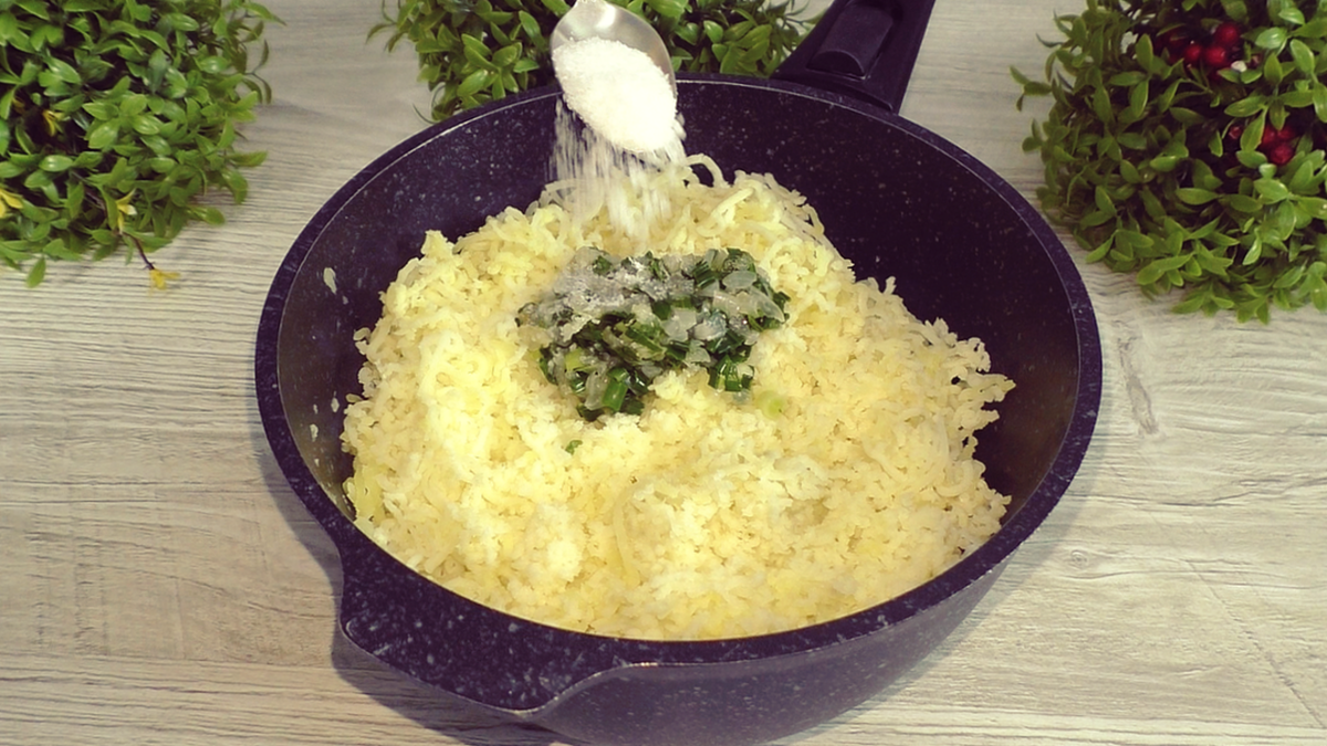 Смешайте обжаренный лук с размятым картофелем, учитывая, что я его не солила перед варкой. Теперь добавьте несколько ложек картофельного отвара и тщательно перемешайте, подгоняя начинку по вкусу с солью и перцем.