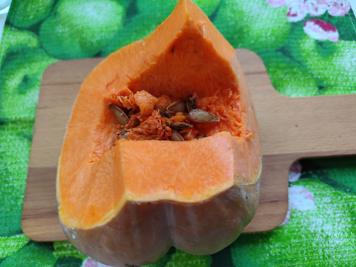Первым делом, тыкву нужно очистить от семян и нарезать на дольки. При желании, можно готовить ее и с кожурой — это только добавит интересный вкус, но процесс займет немного больше времени.