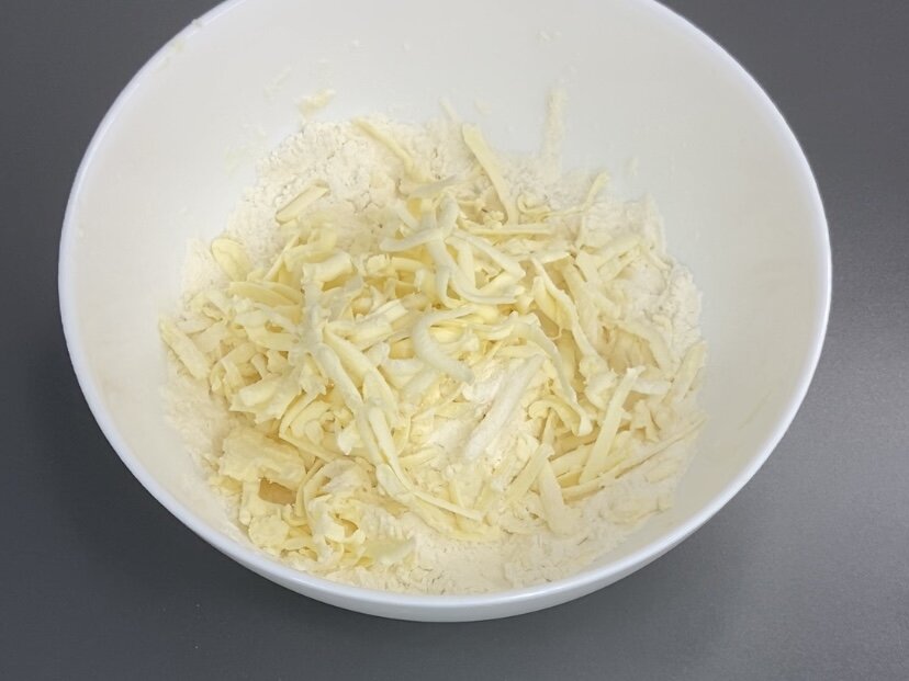 - Охлажденное сливочное масло заверните в муку, перемешав до получения крошки.