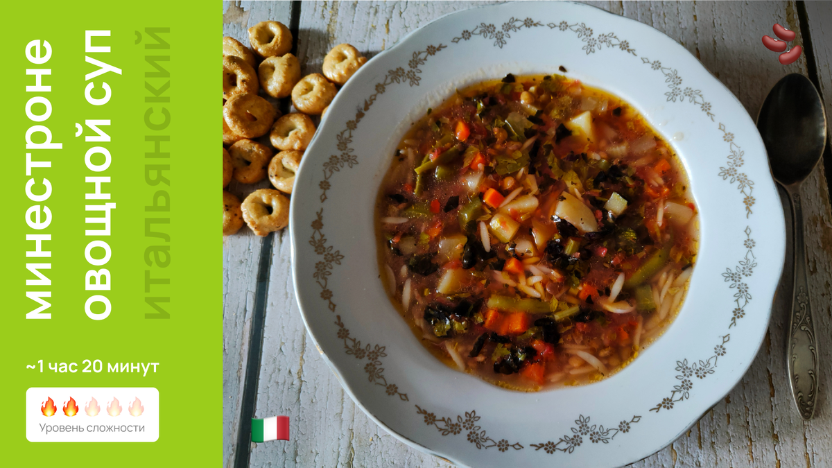 Минестроне обязательно включает бобовые, которые могут быть представленными фасолью или чечевицей. В данном рецепте используется зелёная чечевица — отличный выбор для быстрого приготовления, поскольку её не нужно замачивать. Также суп может быть обогащён пастой или рисом; идеальным вариантом здесь будет итальянская паста ризони.