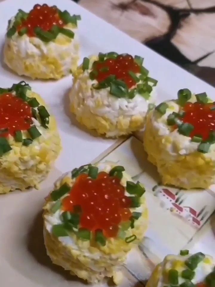 С помощью крабовой смеси сформируйте небольшие бочонки, обваляйте их в желтках и выложите на красивое блюдо. Проведите небольшой углубление в каждой закуске и добавьте красную икру.