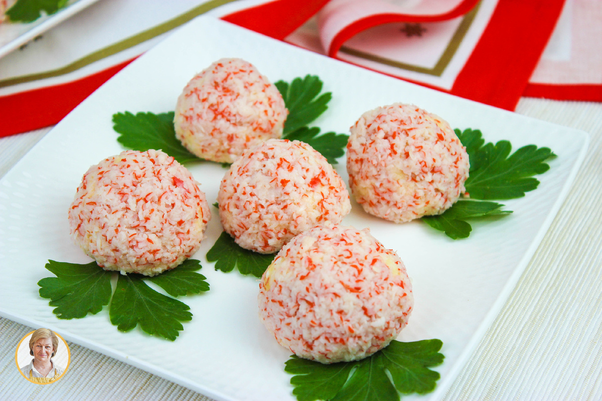 Из смешанного фарша формируют небольшие лепешки, в центр каждой кладут оливку. Лепешки скатываются в плотные шарики размером с грецкий орех и обваливаются в натертых крабовых палочках, что придаст закуске яркий и аппетитный вид.