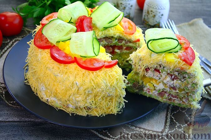 - Кабачковый торт с творогом и ветчиной: Этот уникальный торт из кабачков украшен нежным кремом из творога и сметаны, а также сочной начинкой с овощами и ветчиной. Без майонеза и лишнего жира, он станет идеальным выбором для здоровья.