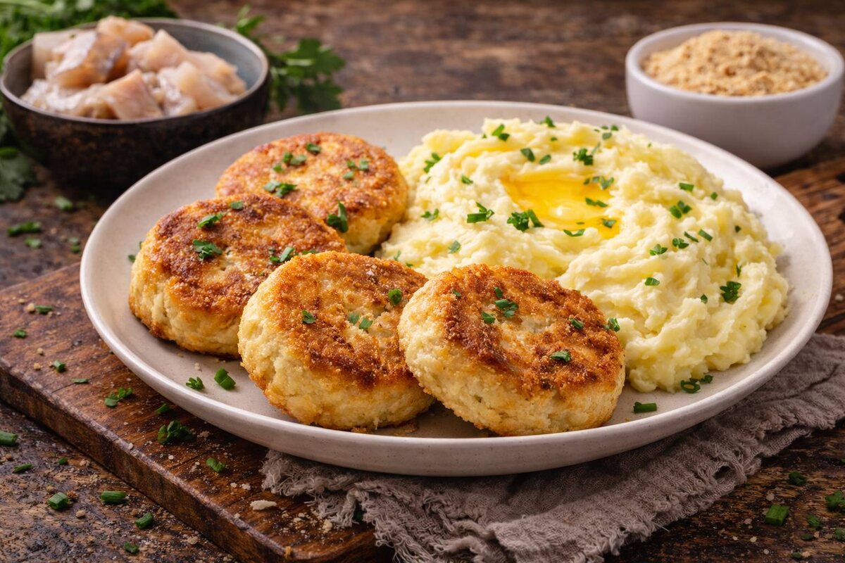 На столе предстает простое, но очень вкусное блюдо — румяные котлеты и нежное пюре, которое обязательно порадует как детей, так и взрослых.