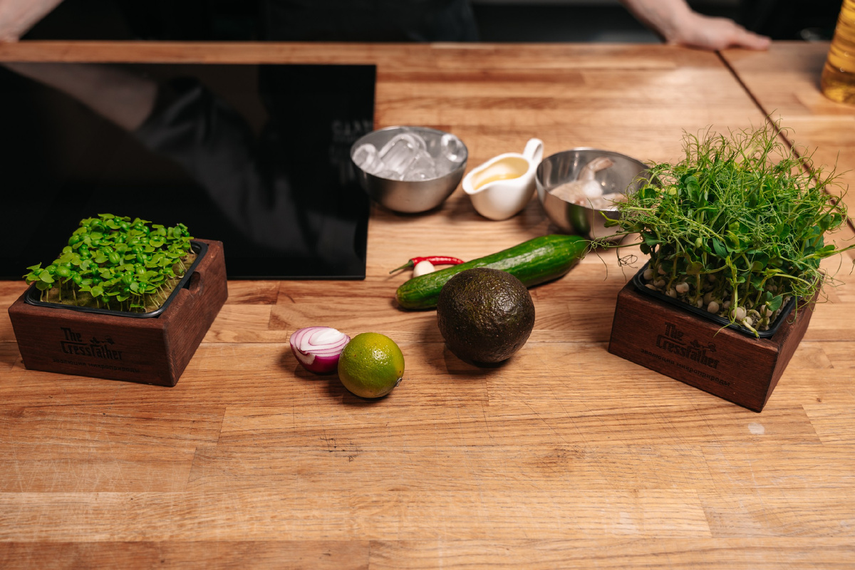 - Для сервировки: креветки королевские — 5 шт., ломтик чиабатты, мини-базилик и кресс-салат.