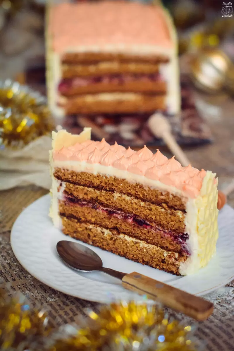Торт собирается в классической последовательности: корж – крем – вишня – корж – крем. В завершение его можно украсить по своему усмотрению, добавив индивидуальности в эту сладкую кулинарную композицию. Этот медовик станет изюминкой любого стола и чудесным завершением новогоднего праздника.