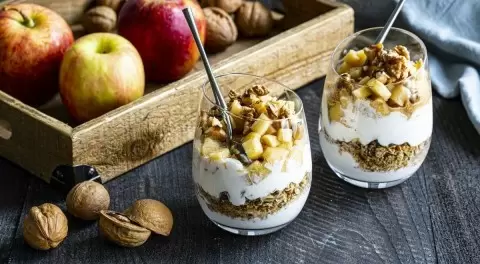 Кисло-сладкие яблоки надолго сохраняют форму после тепловой обработки, а греческий йогурт обеспечивает густоту без тяжести. Гранола добавляет заметный хруст, который контрастирует с кремовой гладкостью. При желании в яблоки можно добавить ваниль или кардамон для слегка более глубокого аромата.