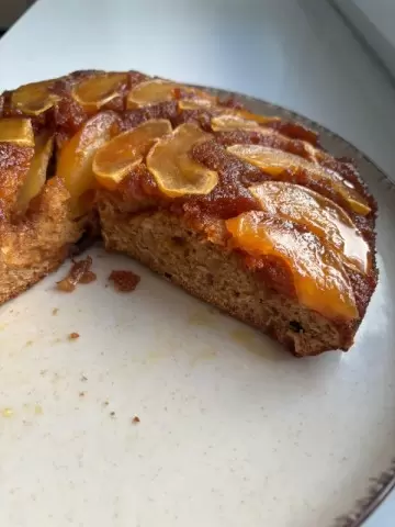 Разогреть духовку до 180°C. Форму для выпечки (около 22 см в диаметре) смазать маслом и слегка присыпать мукой. Вылить тесто в форму, аккуратно распределить карамелизированные яблоки сверху. Выпекать пирог 35-40 минут до золотистой корочки. Проверить готовность с помощью деревянной шпажки — она должна выйти сухой.