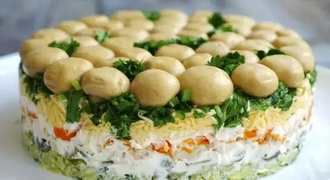 Этот салат восходит к советским временам и быстро завоевал популярность среди домашних кулинаров благодаря своему эффектному виду и сытности. Каждый слой здесь гармонично сочетается, а грибы придают блюду лёгкую пикантность. Название говорит само за себя — на тарелке раскрывается настоящий грибной ландшафт!