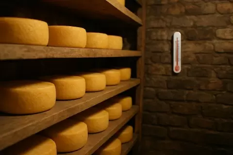 - Влажность: Необходимо поддерживать уровень влажности на уровне 80-85%. Если воздух слишком сухой, сыр рискует стать безвкусным и жестким. В то же время избыточная влажность создает идеальные условия для плесени, что может привести к порче изделия.