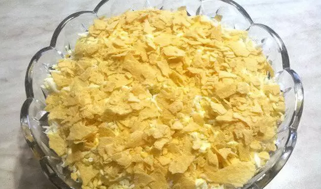 6. Перед подачей на стол украсить салат крошками чипсов, вставив некоторые кусочки перпендикулярно для эффекта.