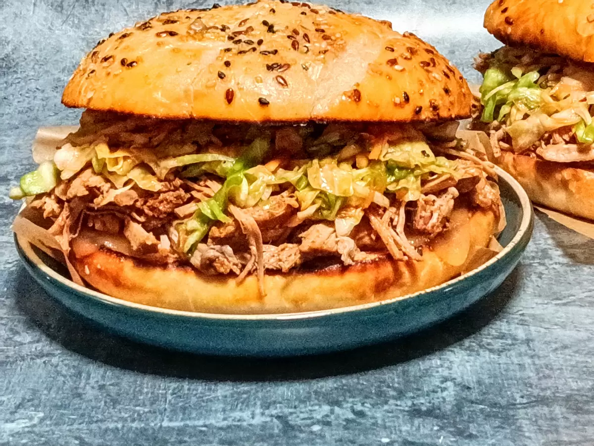 Не забудьте поджарить булочки и нарезать швейцарский сыр! Накладываем 2 куска сыра на нижнюю половину, затем равномерно распределяем рваную свинину, сверху кладем коулслоу и закрываем сэндвич верхней булочкой. Настоящая кулинарная магия готова к подаче!