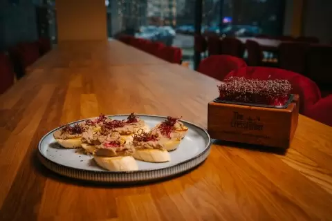 Эта аппетитная закуска поражает своим богатым вкусом и ароматом. Грибная икра, полученная из свежих шампиньонов, прекрасно сочетается с хрустящим багетом, а лёгкий трюфельный привкус добавляет изюминку. Микрозелень амаранта не только украшает, но и придаёт блюду свежесть.